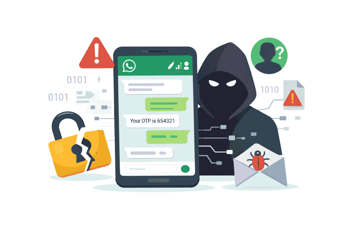 WhatsApp hack का मतलब है कि कोई और बिना आपकी इजाजत के आपके WhatsApp अकाउंट में घुसपैठ कर सकता है। जब ऐसा होता है, तो वह आपकी चैट्स को देख सकता है, मैसेज भेज सकता है, OTP देख सकता है और आपकी पहचान का गलत उपयोग कर सकता है।